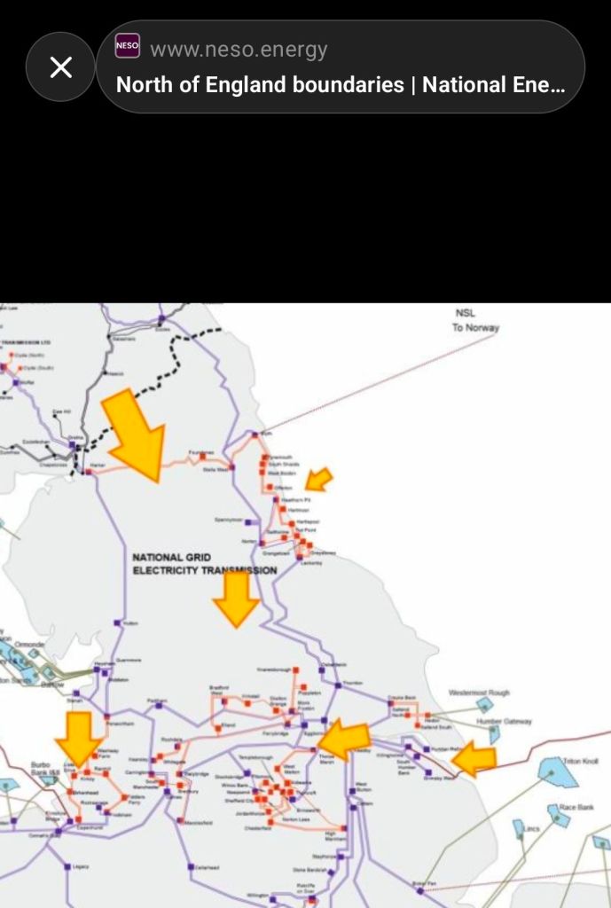 NESO’s own “North of England boundaries” diagram is not about wires but about where power hits a wall in system operation. The arrows converge on the same places: Humber, Teesside, Yorkshire , the exact corridor the physical map shows.