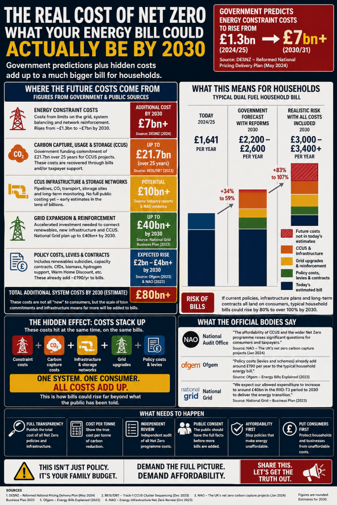 Official projections suggest that a typical dual-fuel bill of approximately £1,600 today could rise to between £2,200 and £2,600 by 2030 under current assumptions.⁶